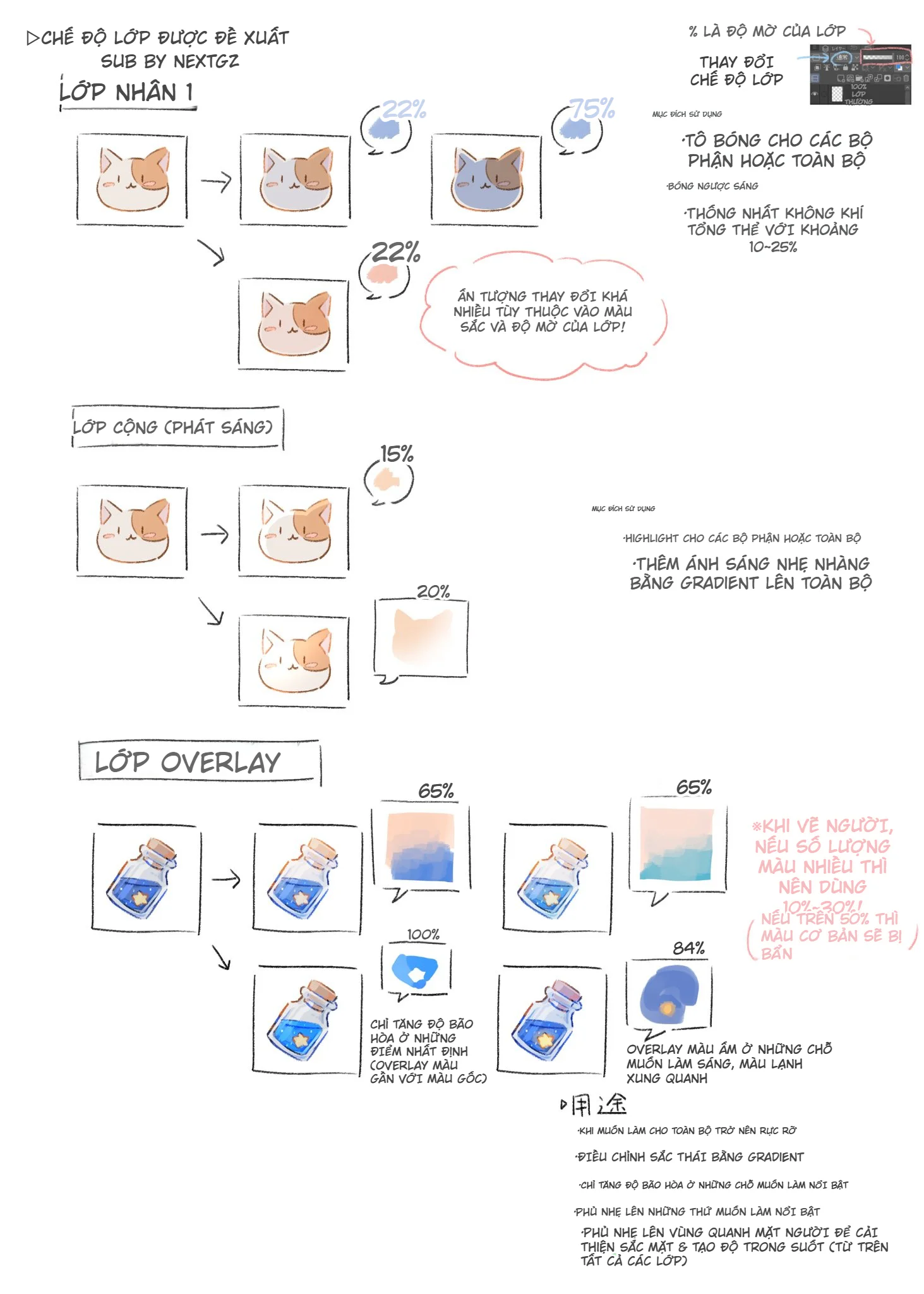 Overlay (tầm 50–70%, tùy tranh): tăng tương phản và “độ đã” màu; dùng để phủ màu ấm/lạnh lên vùng lớn, hoặc nhấn màu ở điểm cần nổi.