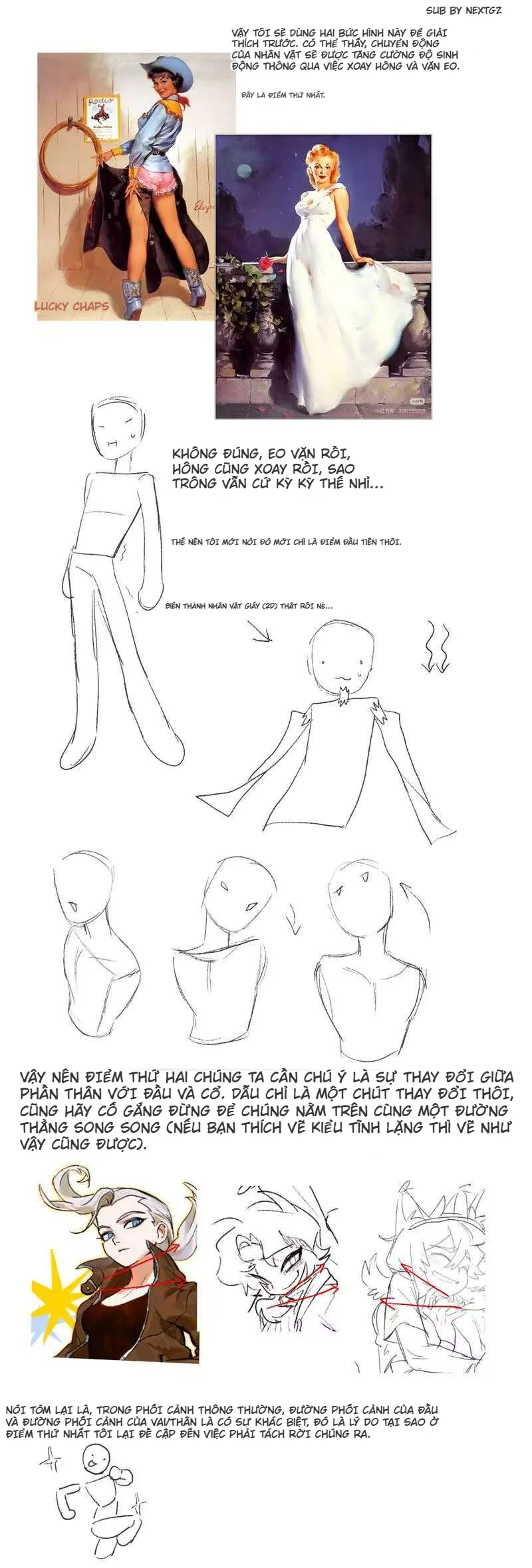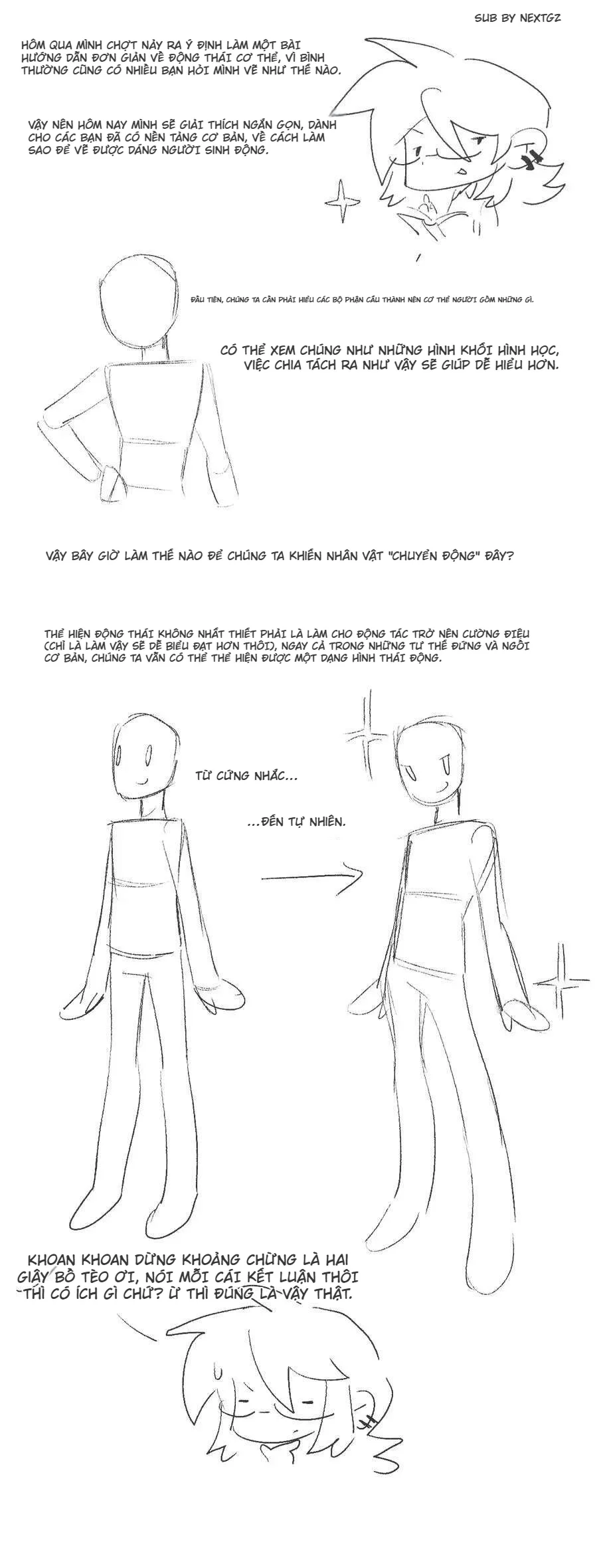 Điểm hay nhất của bộ tutorial này là nó không biến “động thái cơ thể” thành cái gì quá hàn lâm. Nó kéo mọi thứ về đúng cốt lõi: cơ thể là khối đang chuyển động, không phải tượng đứng yên. Muốn pose sinh động, bạn phải để vai và hông có quan hệ với nhau, để torso có hướng trong không gian, để quần áo đi theo lực của form bên dưới, và để các bộ phận bắt đầu chồng lấn nhau một cách có chủ đích. Những nguyên tắc này cũng là nền của gesture drawing: ít nét, rõ flow, rõ trục, rõ nhịp, rồi mới chi tiết hóa dần.