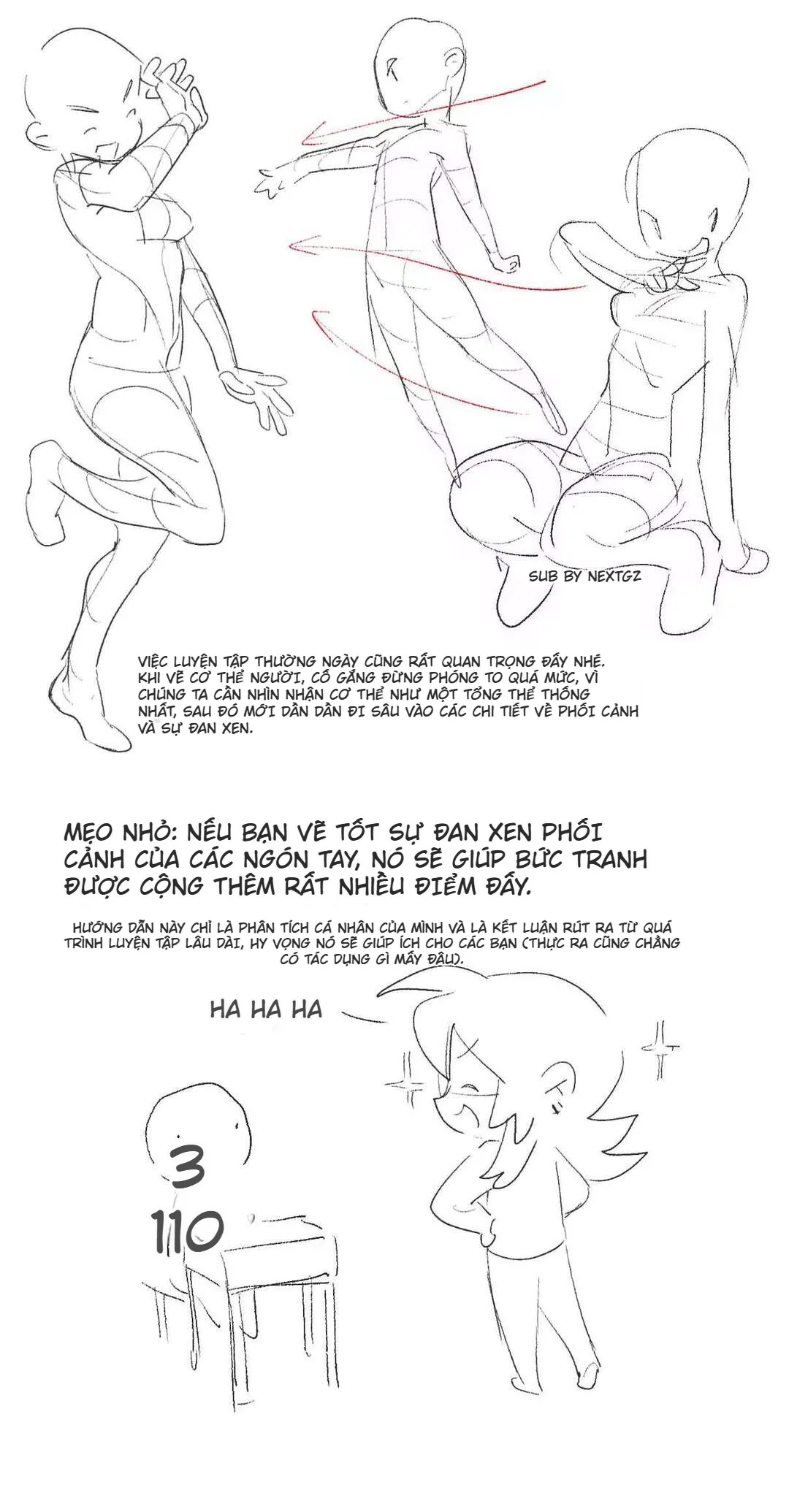 Trang cuối bộ ảnh nhấn vào một mẹo nhỏ nhưng thật ra rất lớn: nếu bạn xử lý tốt sự đan xen phối cảnh, đặc biệt ở ngón tay, cánh tay, đầu gối, bàn chân, tranh sẽ tăng điểm ngay. Đây là nhận định rất đúng. Khi các bộ phận bắt đầu chồng lên nhau, xuyên qua nhau theo logic không gian, mắt người xem sẽ cảm nhận được chiều sâu rõ hơn nhiều. Trong giáo trình Drawabox, overlap được xem là một công cụ cốt lõi để nhấn mạnh rằng bạn đang làm việc trong không gian ba chiều, không phải trên một tờ giấy phẳng.