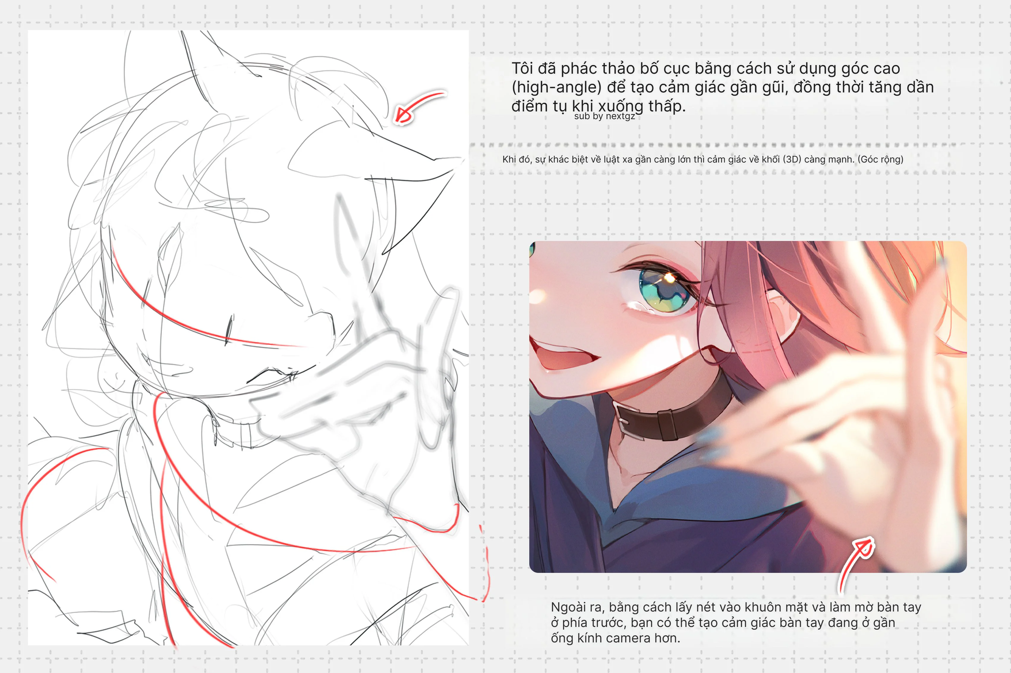 Cốt lõi của kiểu tranh này là phải khiến người xem cảm thấy có ống kính camera đang đặt rất gần nhân vật. Khi đó bàn tay hoặc vật thể ở tiền cảnh có thể mờ và to hơn, còn khuôn mặt phía sau vẫn rõ nét hơn. Đây là logic rất giống phối cảnh trong figure drawing: các phần gần người xem cần được phóng đại và rút ngắn hợp lý để tạo cảm giác không gian. Clip Studio TIPS cũng nhắc rằng foreshortening có thể áp dụng cho bất cứ thứ gì cần tạo cảm giác tiến về phía trước hoặc lùi vào không gian 3D trên mặt phẳng 2D.