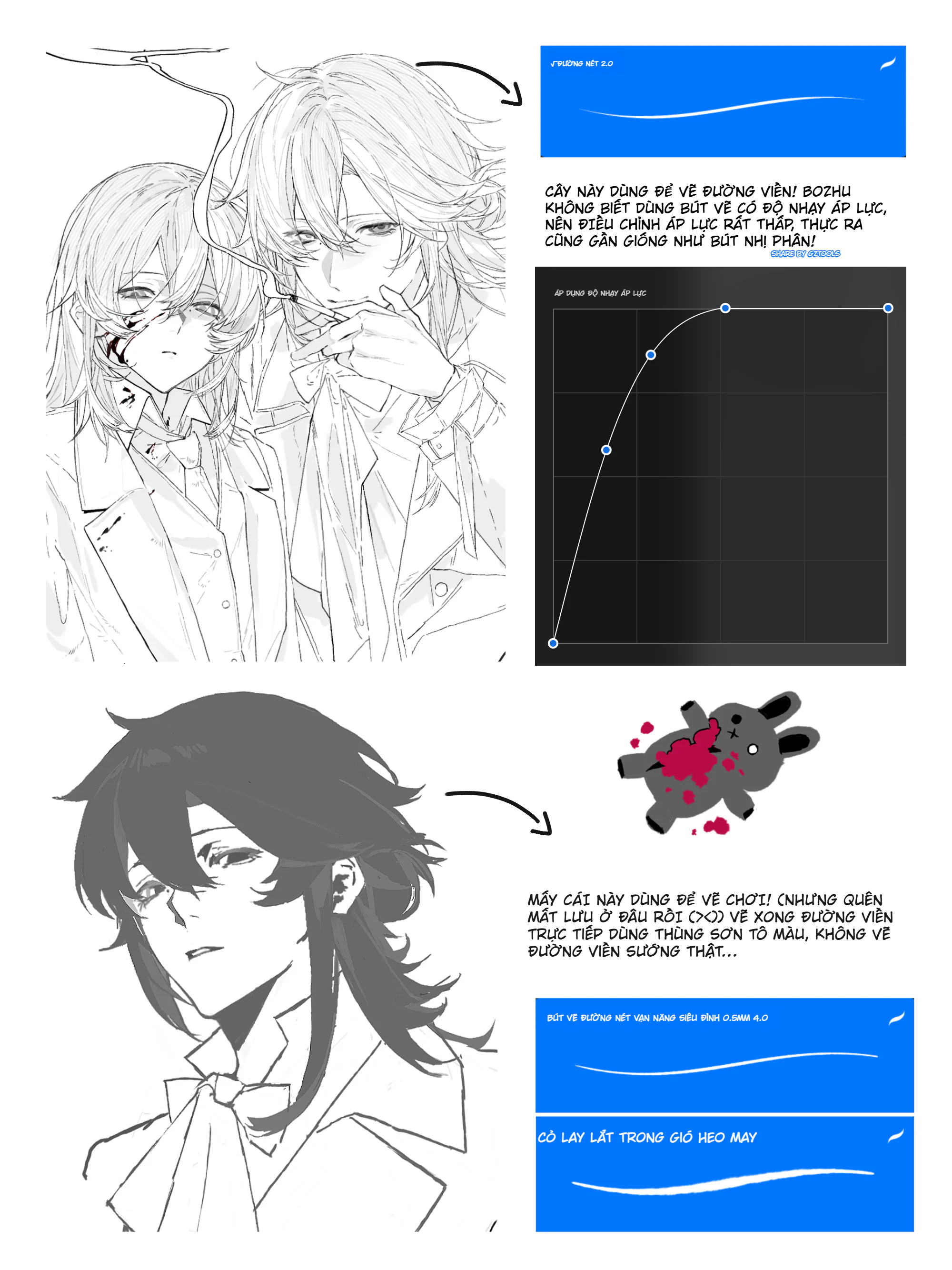 – Cây line (勾线笔) là mình tự “nghịch” ra: mình để độ nhạy áp lực thấp để nét ổn định, kéo ra kiểu giống bút nhị/pen cứng, đi viền rất đã tay. (Nhìn cái pressure curve trong ảnh là hiểu liền.)