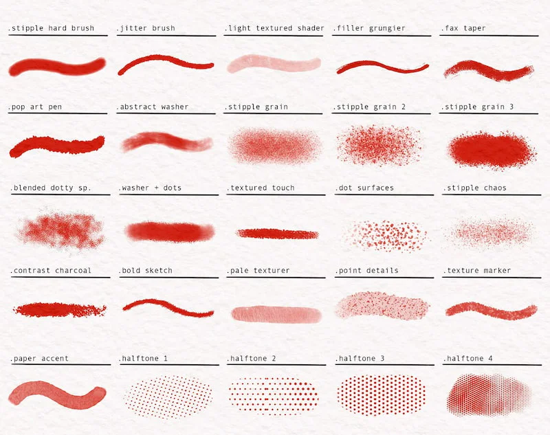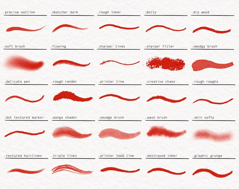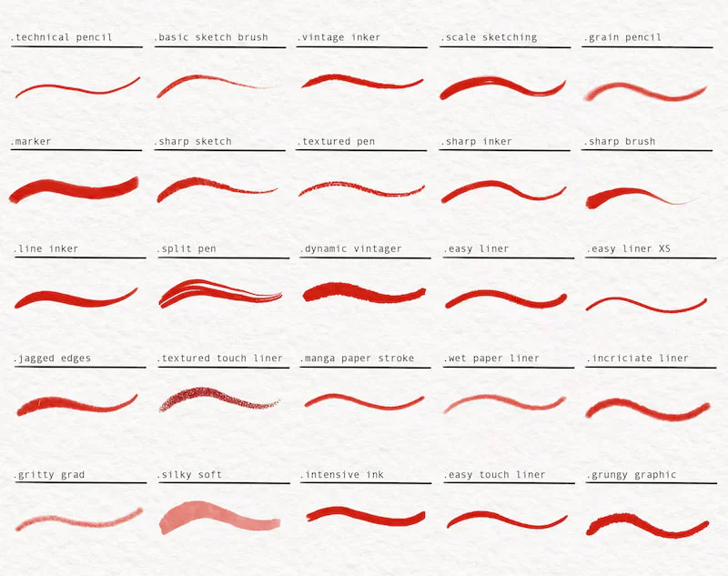 Bộ cọ toàn diện này được thiết kế dành riêng cho các họa sĩ manga và anime, đáp ứng mọi nhu cầu của bạn cho dù bạn là người mới bắt đầu hay là họa sĩ chuyên nghiệp. Bộ sản phẩm bao gồm tất cả những gì bạn cần: từ cọ đi nét thanh (细线), cọ viền nét đậm (粗线), chì phác thảo và đánh bóng, cọ vẽ hiệu ứng halftone (chấm tram), cho đến các kết cấu giấy liền mạch (seamless paper textures).